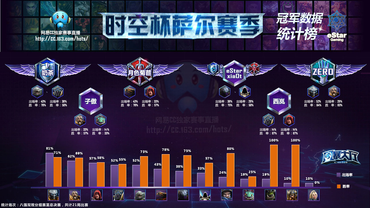 回顾由网易CC策划主办的《风暴英雄》时空杯萨尔赛季冠军得主eStar战队的一路走来,可谓是大起大落,险象环生。首先在八强分组赛时遭遇劲敌EDG,战败落入败者组,其后在败者组中先后遇到OMG、X-Team、AGL以及韩国实力战队TNL,被对手多番拿下赛点,几经奋战,eStar终于突围而出,进入总决赛,再次迎战EDG。eStar在时空杯萨尔赛季赛场上,共进行了21局比赛,网易CC对这支绝境逢生,越战越勇的战队进行全程数据统计,并挑选出了最精彩的五个镜头,作为本届时空杯的冠军集锦。