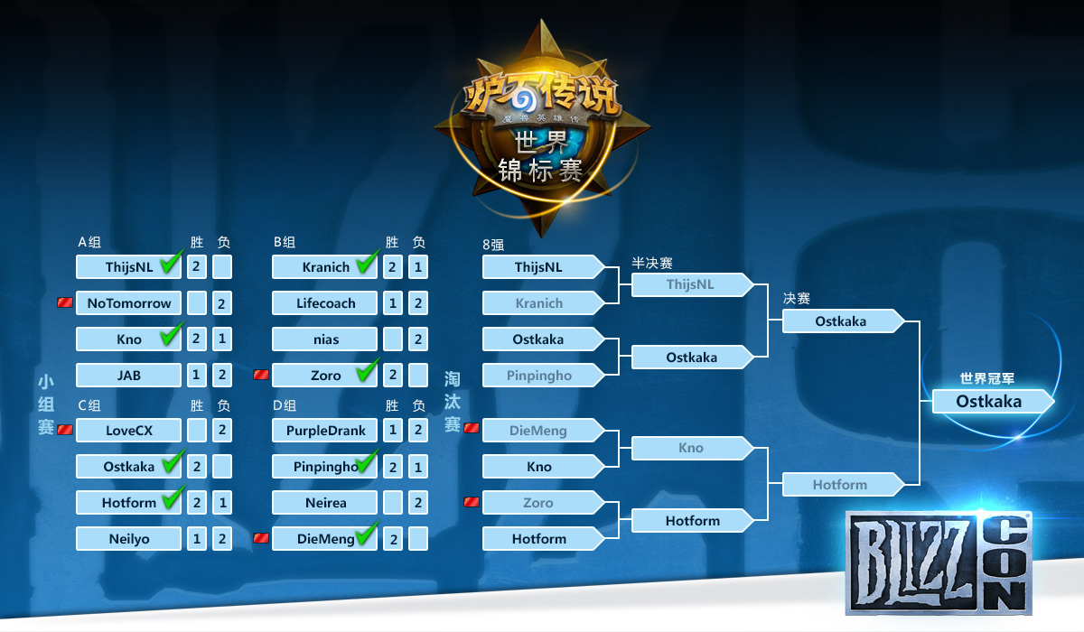 本次代表中国出征《炉石传说》世界锦标赛的4位选手分别是EDGNoTomorrow(明天不见)、YMLoveCX、DieMeng(蝶梦还未醒)及CLZoro。前两位选手遗憾在小组赛遭淘汰,而DieMeng(蝶梦还未醒)及CLZoro也未能在8进4的比赛中战胜各自的对手,最终止步8强。另一方面,首次参与世锦赛的日本选手Kno表现惊艳,最终与荷兰名将ThijsNL共同进入4强。而总决赛则在瑞典选手Ostkaka及加拿大选手Hotform之间展开,本场比赛的进程和去年世锦赛的决赛十分相似,去年夺冠的Firebat是以德鲁伊穿三的成绩在KOF赛制中战胜了中国选手小鱼鱼大先人,而本场决赛,双方的六组套牌均得以出场,只是获胜者和失败者始终没有改变。三盘较量,Ostakaka的冰法战胜了Hotform的火妖法;奴隶战力克了对手的刀油贼;最后一局Ostakak的刀油贼又斩杀了Hotform的德鲁伊。就这样Ostkaka以3:0的成绩,兵不血刃,夺得了本届嘉年华炉石世锦赛最后的冠军!