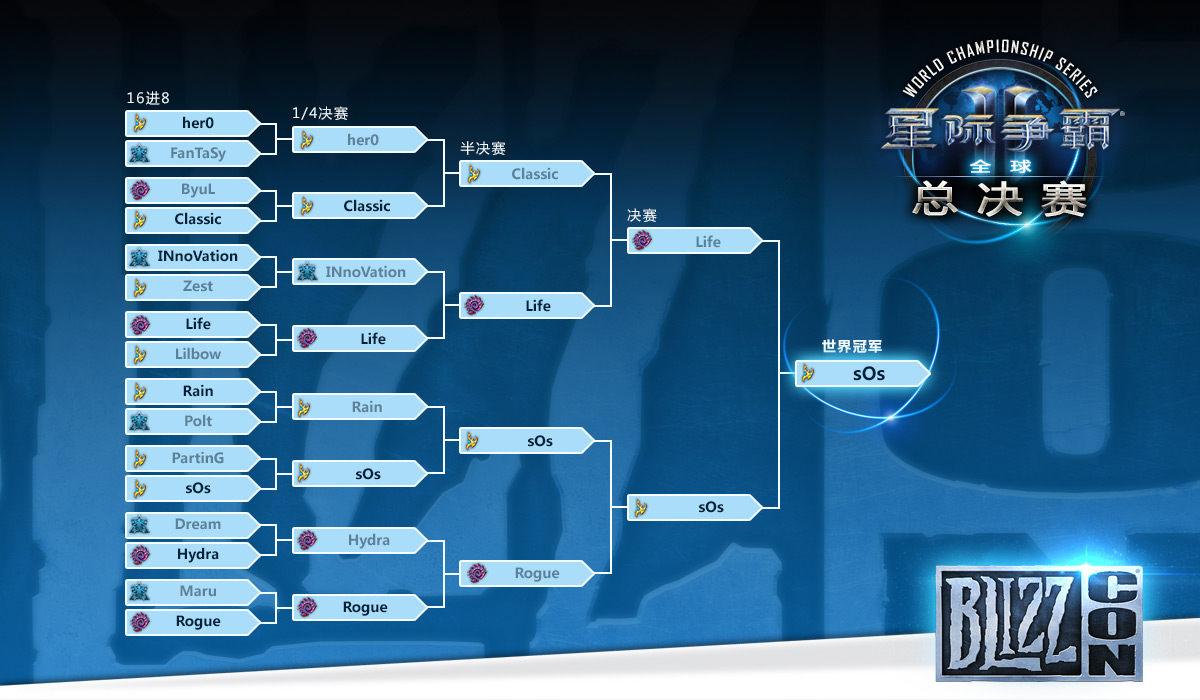本年度的星际世锦赛依然没有中国选手的身影,仅由Lilbow 1位法国选手及15位韩国选手组成。但本届比赛同样看点无数,Classic、Life、Rogue等实力选手都为我们带来了精彩的比赛。而总决赛的对决更是堪称史诗级别:两位顶级选手sOs与Life为我们呈现了一场在操作上毫无瑕疵的旷世大战,而两位的心理博弈同样堪称经典。双方战成3:3后,在决胜局中,Life再次使用了其擅长的爆虫快攻的战术,sOs则依靠建筑学与力场步步为营,将Life的攻势逐步化解的同时再次扩张并集结起了一支大军向Life反扑,掘地爪科技尚未完成的Life节节败退,在退回二矿的时候sOs以华丽的力场终结比赛。sOs在夺得本次世锦赛冠军的同时也为《星际争霸II:虫群之心》赛事画上了一个完满的句号。